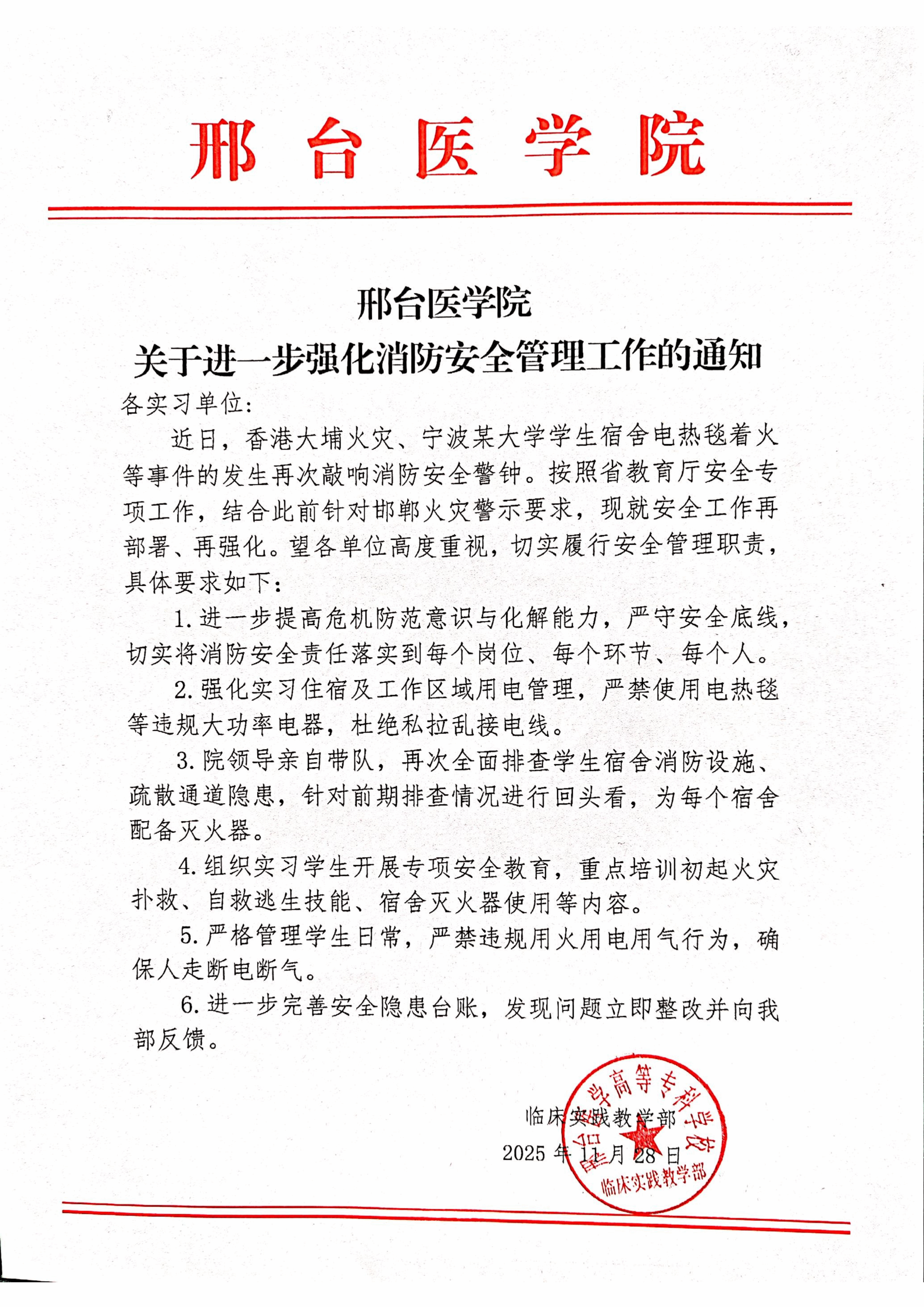 邢台医学院关于进一步强化消防安全管理工作的通知